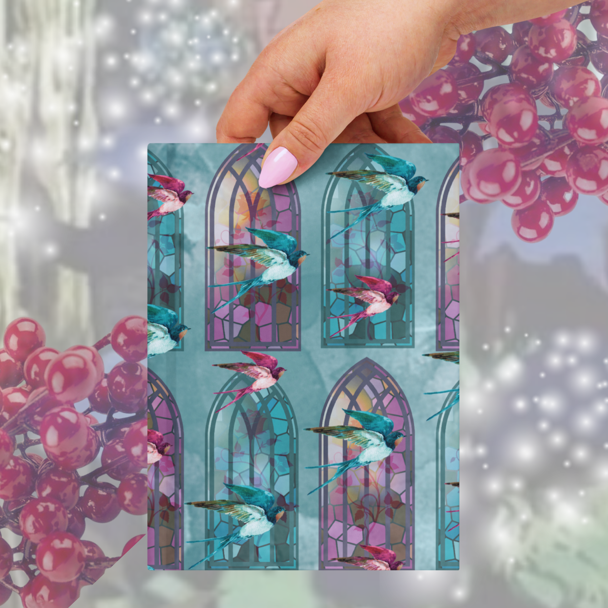 Awaken your creativity with this enchanted Sleeping Beauty inspired notebook, lovingly designed by me! Featuring stained glass windows, delicate roses, and charming songbirds to represent her fairy gifts of beauty and song, this magical notebook is perfect for journaling, scrapbooking, junk journaling, or spell work.